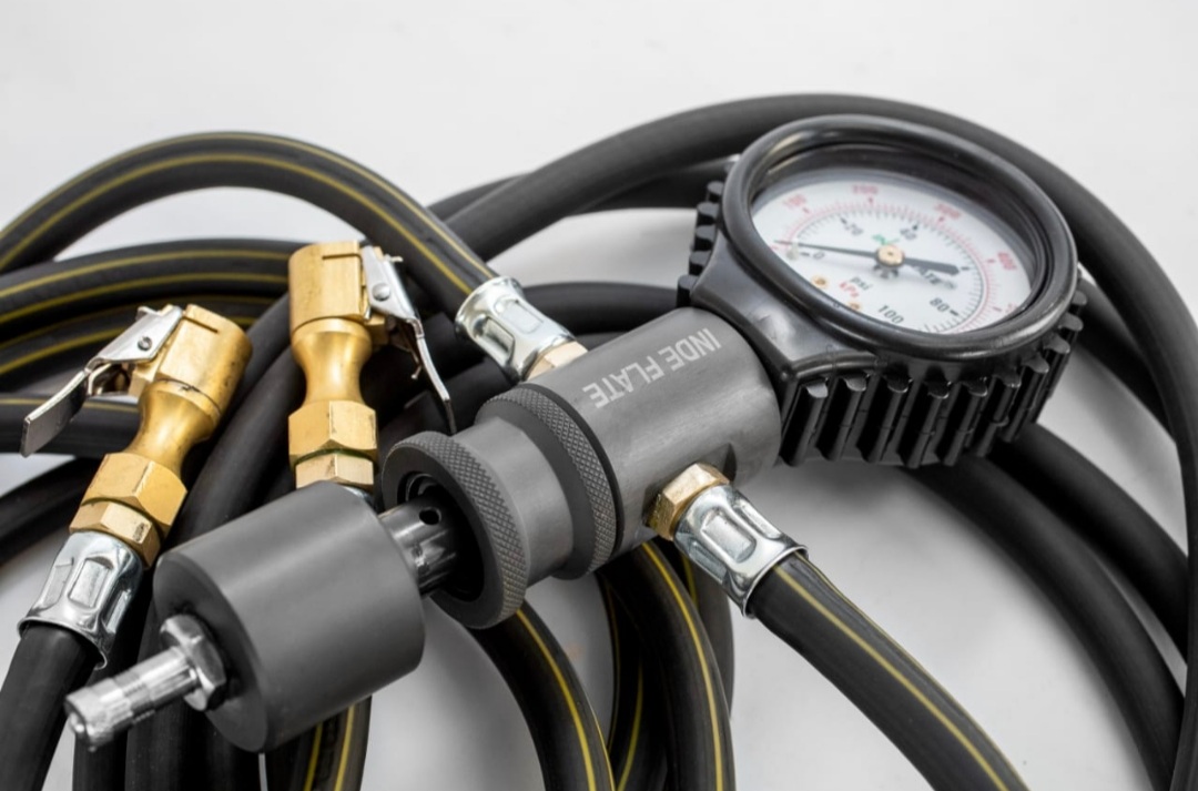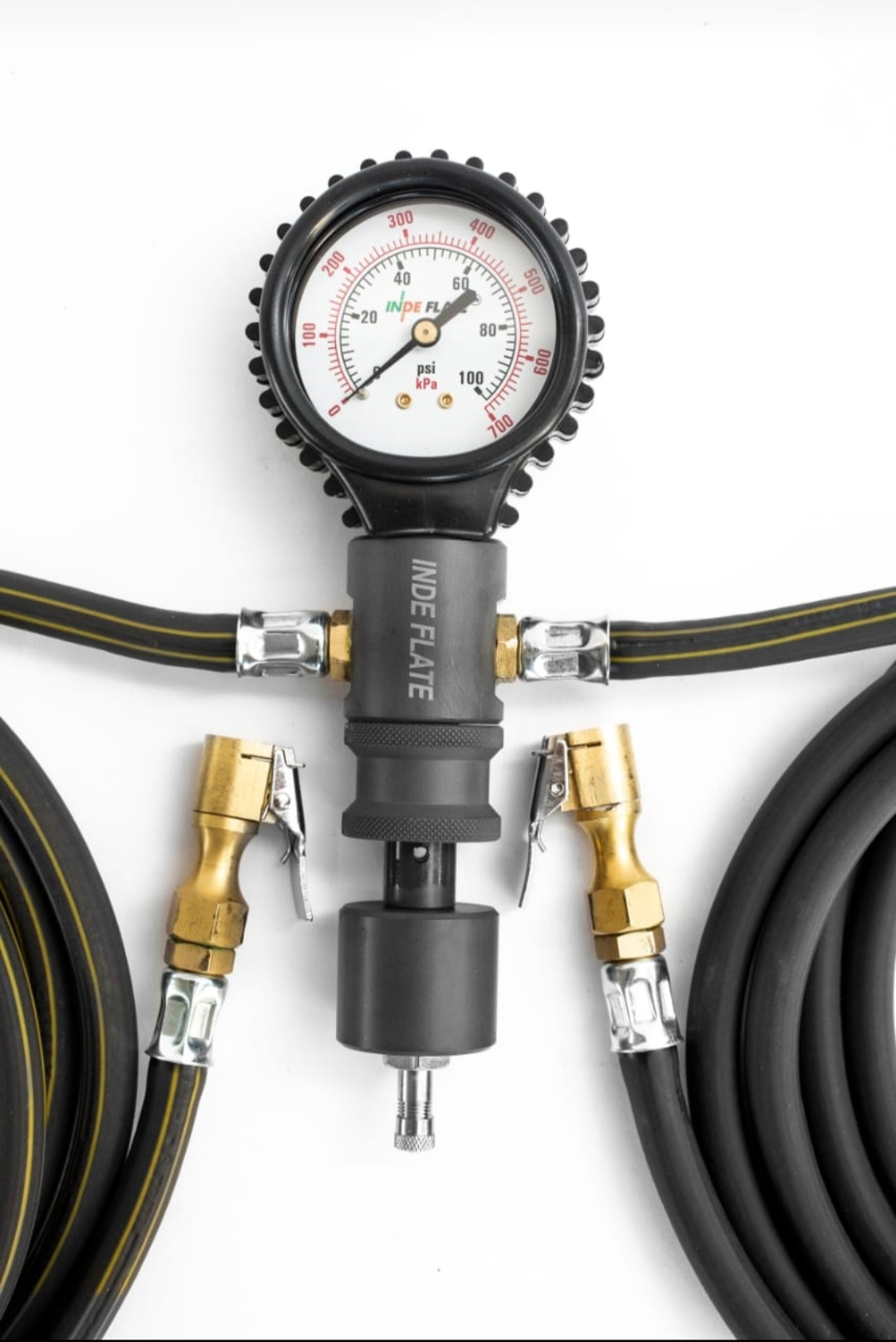 The indeflate is a device used to inflate or deflate 2 tyres simultaneously and equalises pressure between the two once connected.